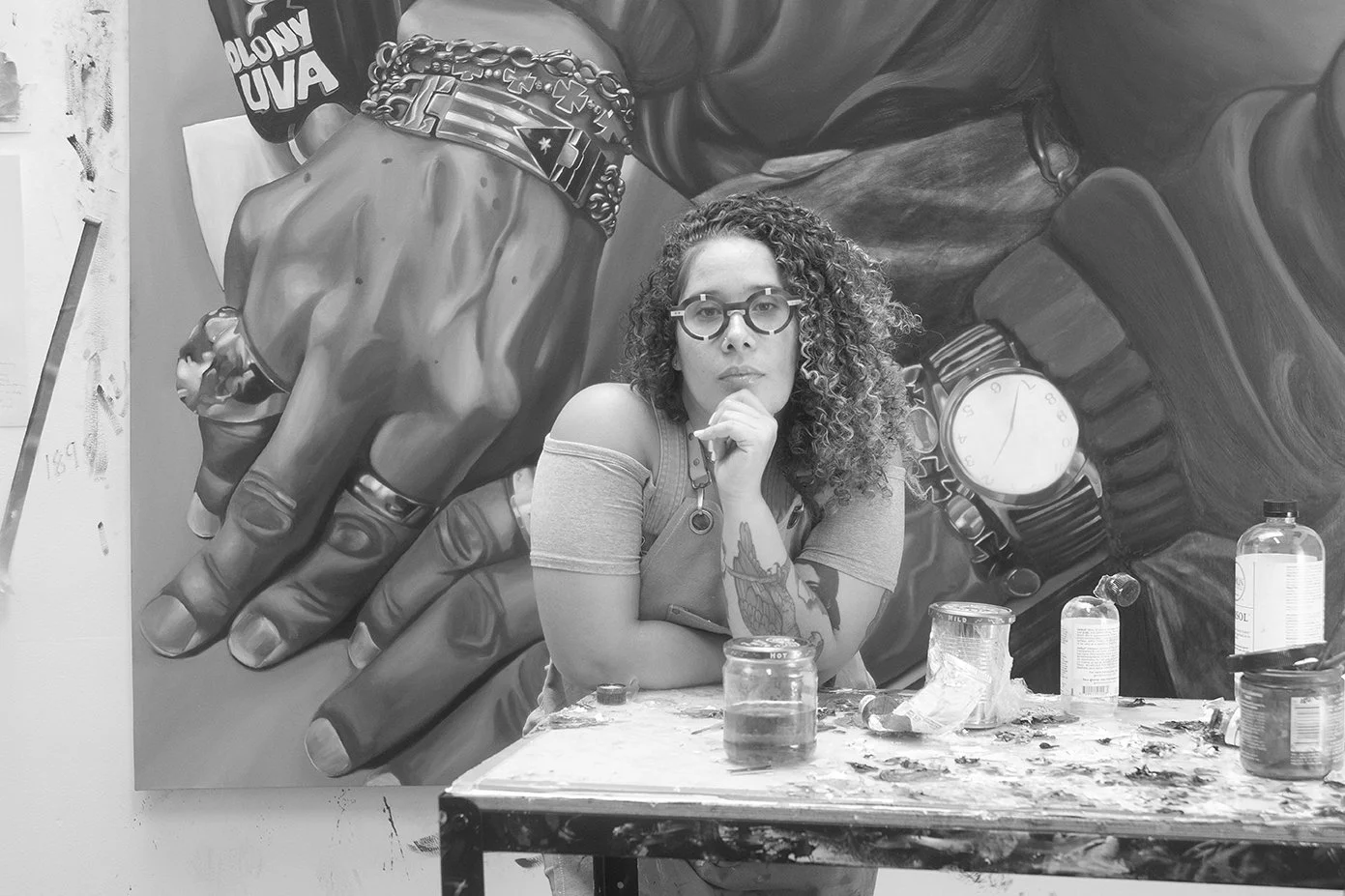 Danielle De Jesus is a Nuyorican painter and photographer born and raised in Bushwick, Brooklyn, whose works tell the story of growing up in New York City amidst gentrification and displacement. She draws from her experience growing up in the diaspora as a native of Bushwick, New York, to document her home neighborhood while creating narratives that uplift the lives and stories of the multi-diverse residents she grew up with. De Jesus’ background is in photography, and she utilizes her images of the people native to Bushwick as a reference to tell the story of Bushwick’s displaced residents, informed by her personal experiences with gentrification and displacement. Danielle De Jesus’ images make us rethink the significance of the image and the politics of representation involving the largely low-income people of color depicted in her paintings. Her work pushes us to think critically about the larger economies of urban America, but also about matters of intimacy and the interior lives of local residents. Ultimately, her works make viewers think about the effects of capitalism and the urban settler colonial histories impacting Puerto Rican diaspora communities in Brooklyn, Puerto Rico, and beyond. Danielle works in painting, photography, and uses multimedia objects such as dollar bills and common household items such as tablecloths to create textured stories of everyday life and resilience.