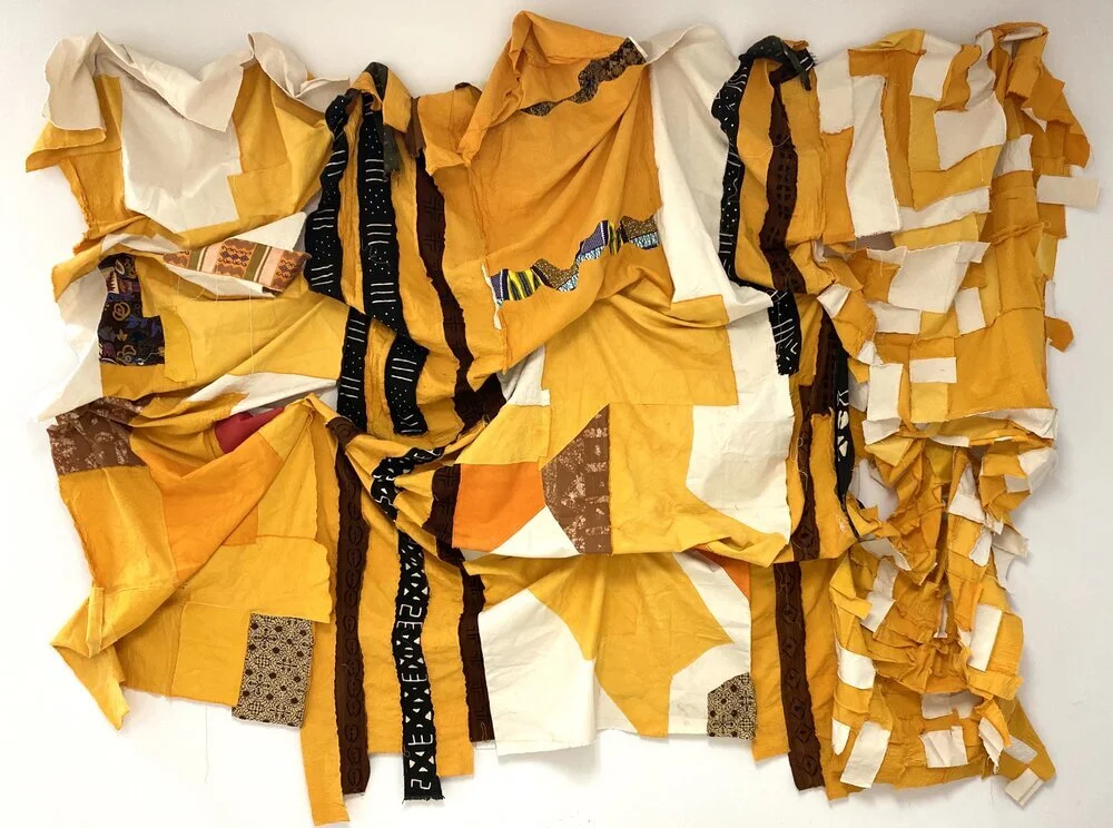 Kwesi Kwarteng is an Ghanaian born artist based in Newark NJ. He mostly works using textiles from various cultures and sewing them to make his pieces. Having a painting background Kwesi approaches his work like he would his paintings. He considers the fabrics as the paint he uses in making these works and sewing as the brush that brings them together. He dyes canvases using different dying processes then combining them with textiles to create his works. He is interested in what function these fabrics plays in the lives of the people who use them and attempts to connect this interests in his works. As a Ghanaian what one wears is a very essential part of the daily life. It could tell if one is morning or if one is happy. If one has survived a tragedy or if one is going through a trial. Fabric is and unspoken language the conveys messages to those who know. And Example is the Kente cloth from Ghana which features predominantly in many of his works