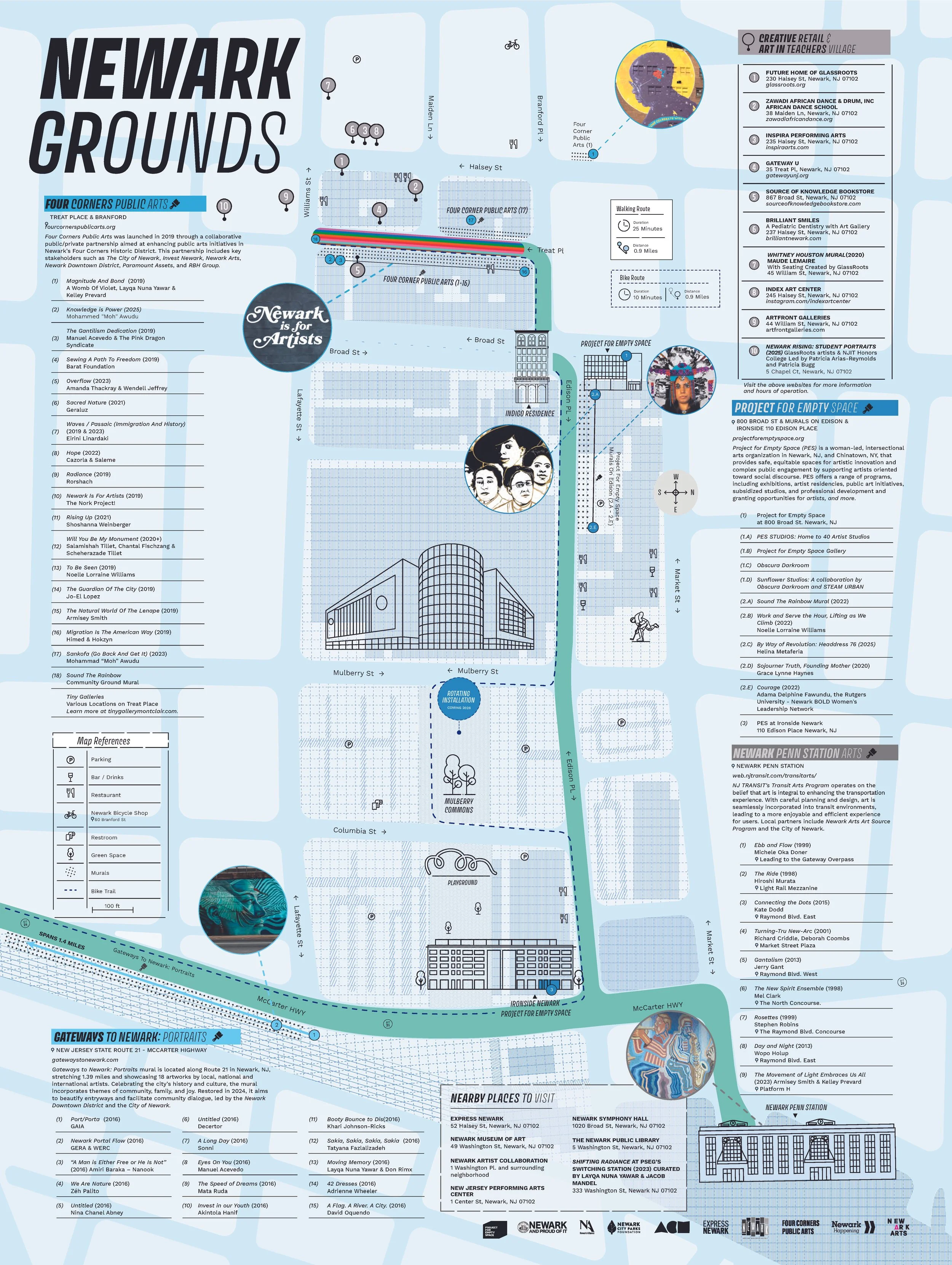 The initiative bridges public art projects from Four Corners Public Arts, Project for Empty Space, and Gateways to Newark: Portraits, along with selected works from New Jersey Transit’s public art program at Newark Penn Station. It is strategically situated within the Arts and Education District, established by Mayor Ras J. Baraka in Fall 2022.
