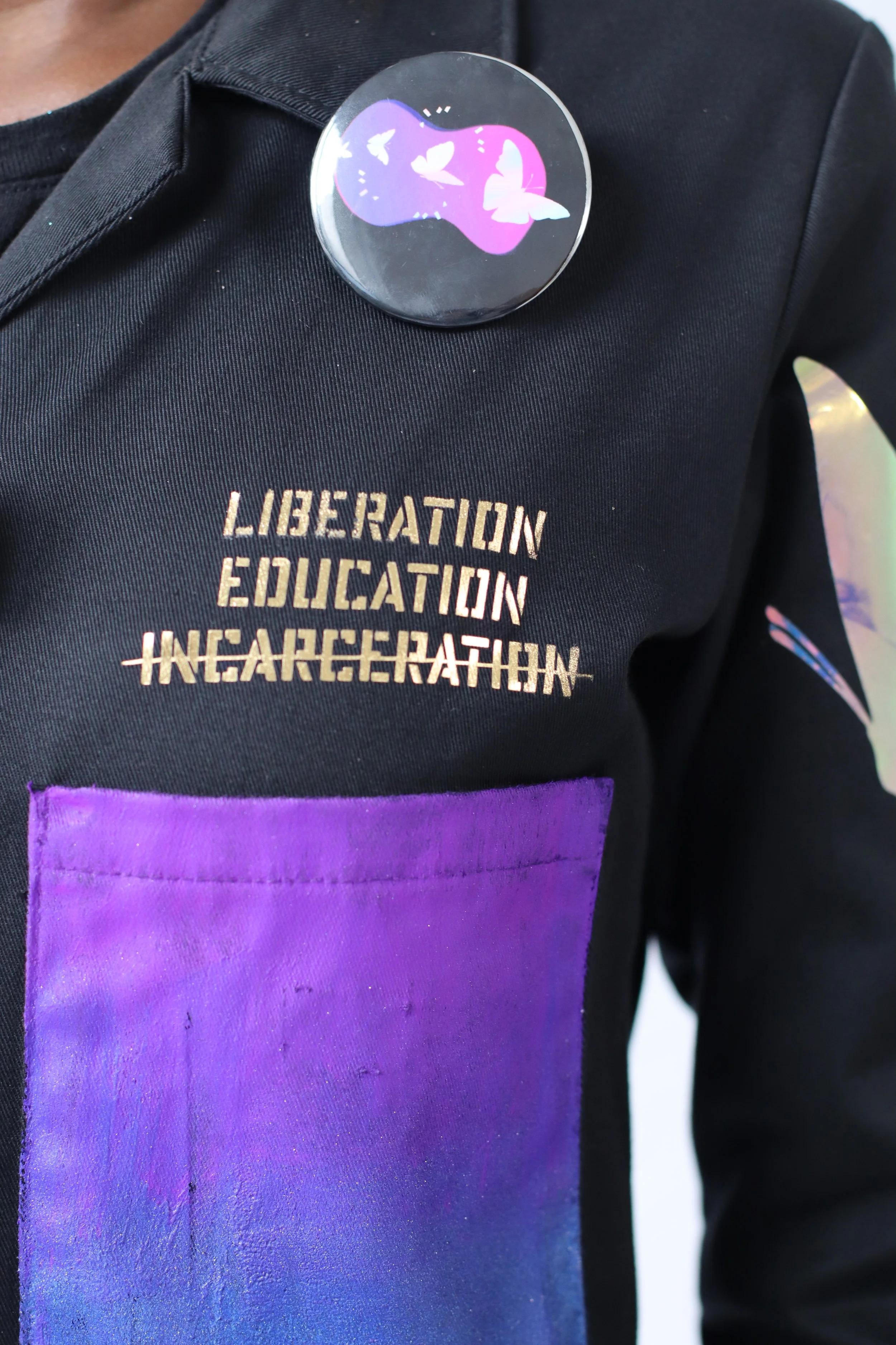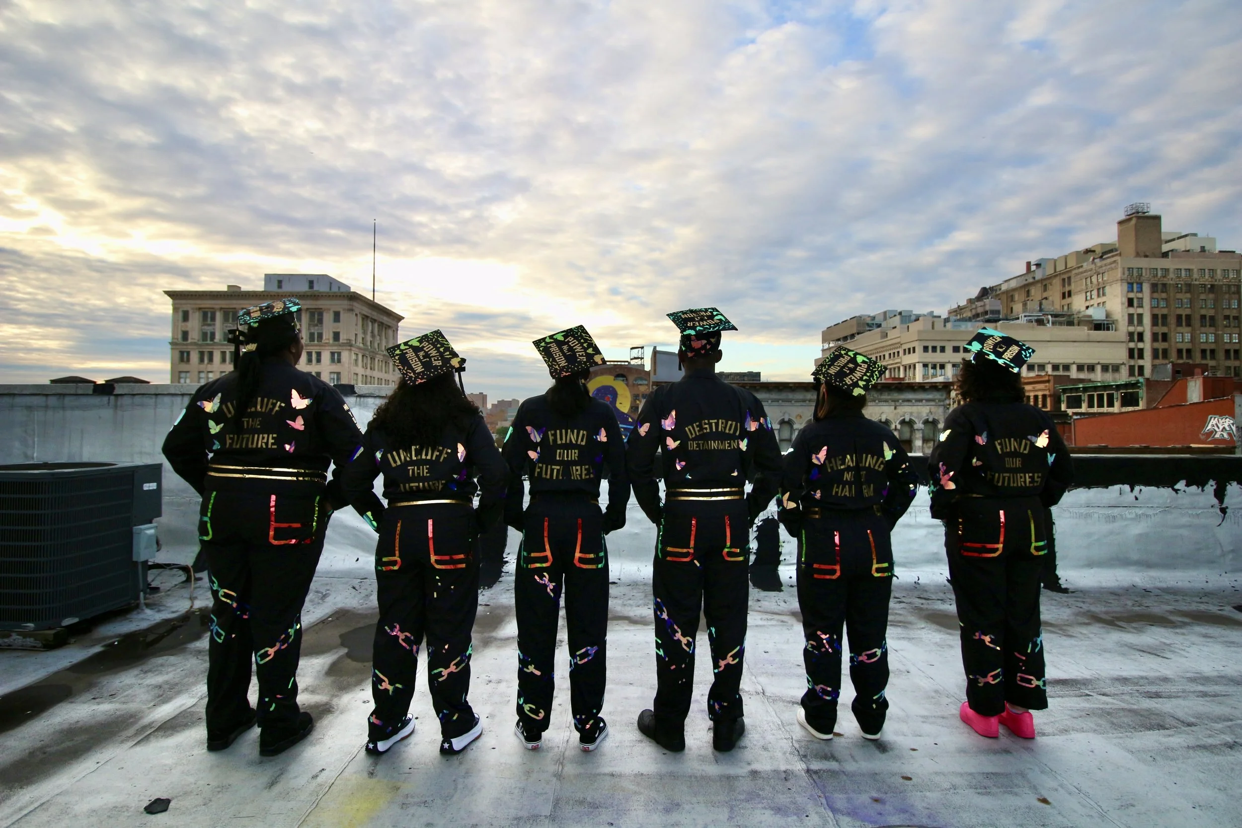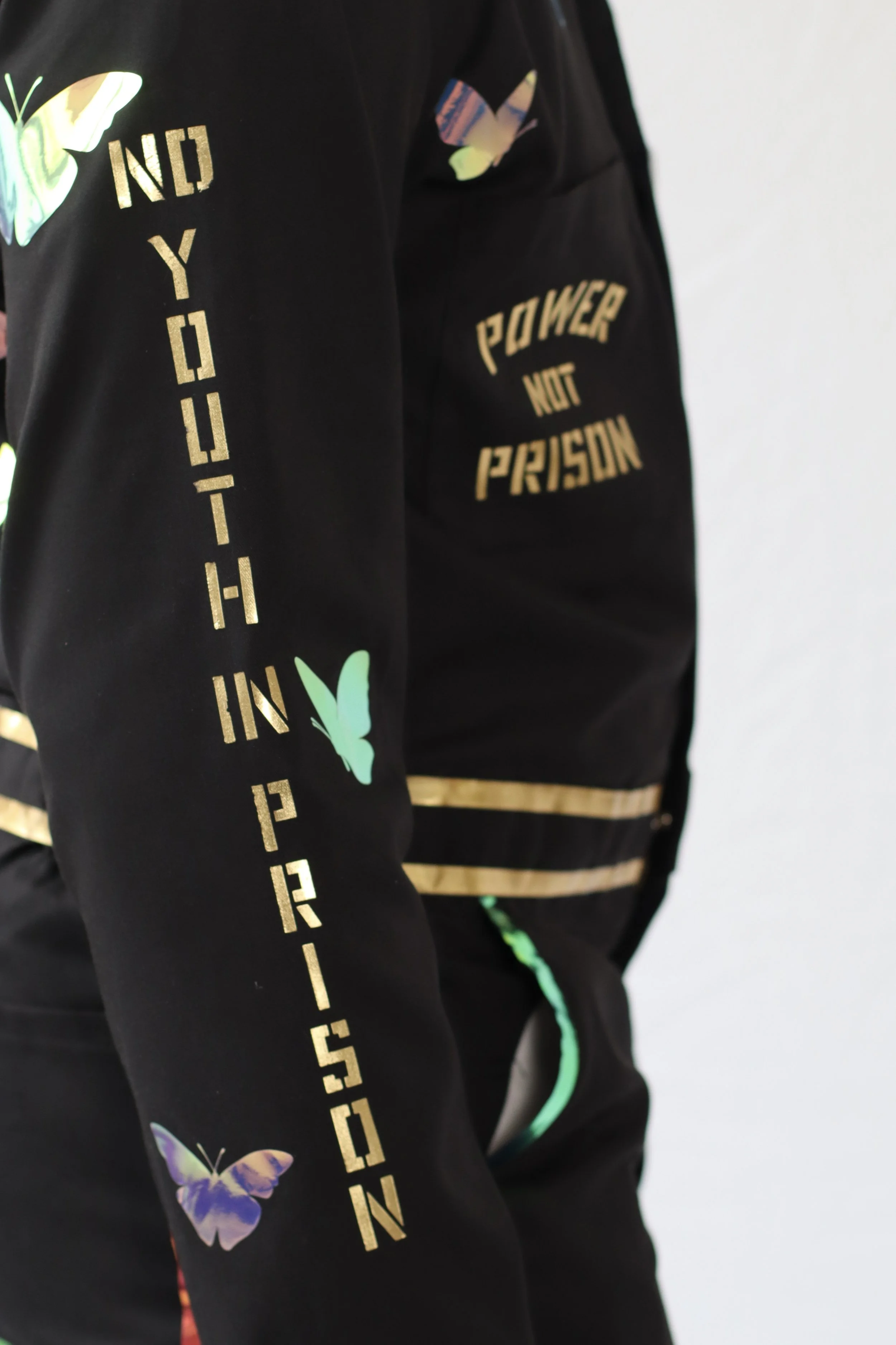 The collaboration included the development of abolitionist jumpsuits envisioned by Y4JNJ organizers from Newark and Camden, New Jersey. The jumpsuit acts as a placard for a series of gold messages illustrating power. Traditionally, jumpsuits are used in prison to make people feel powerless and rob them of individuality. Y4JNJ organizers chose to use this project as an opportunity to take back this garment, using it as a canvas, adorned with holographic chains breaking into butterflies symbolizing positive transformation, liberation, and success. The organizers wear these jumpsuits in the campaign banners, but also as a form of demonstration in organizing events, conferences, and more.