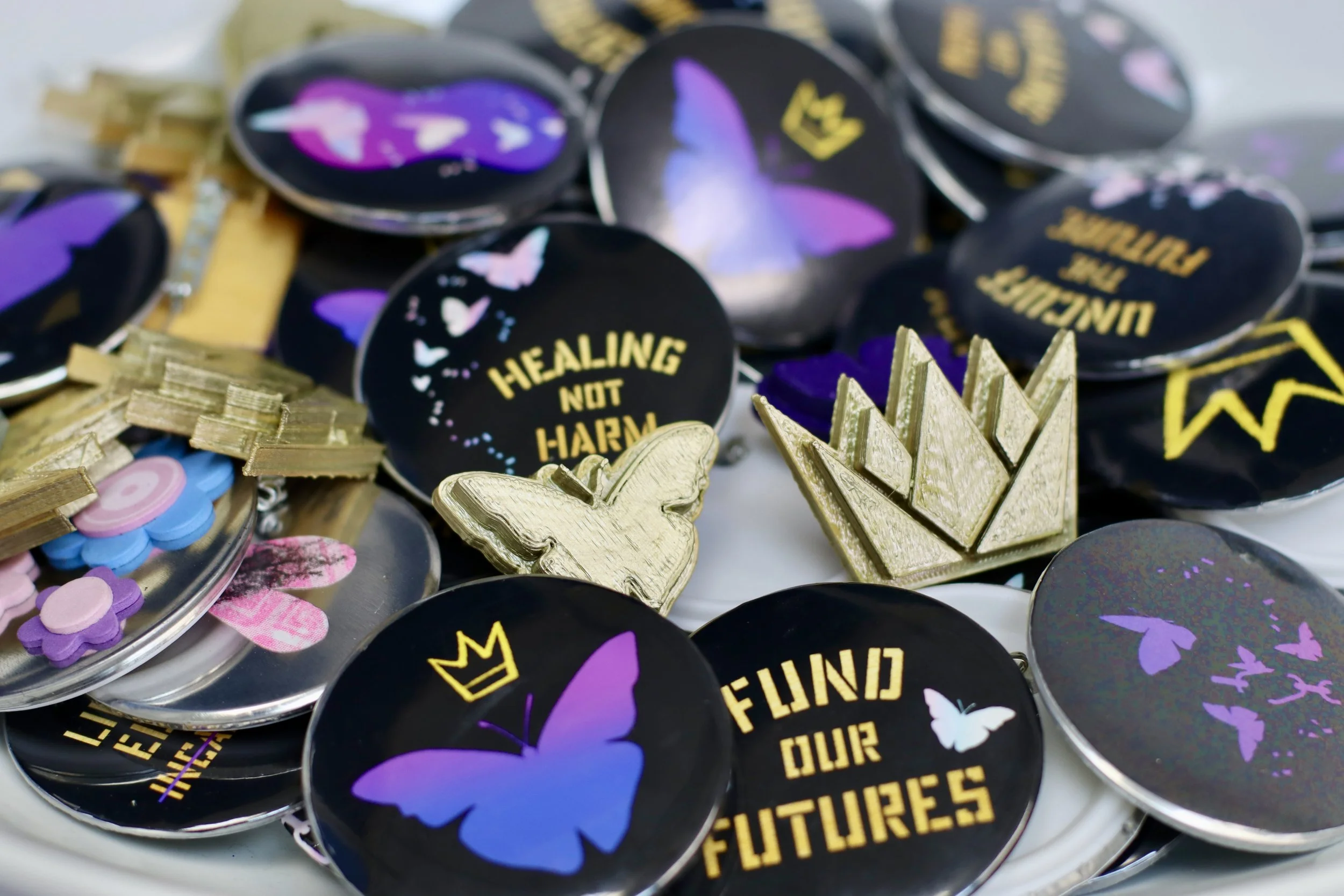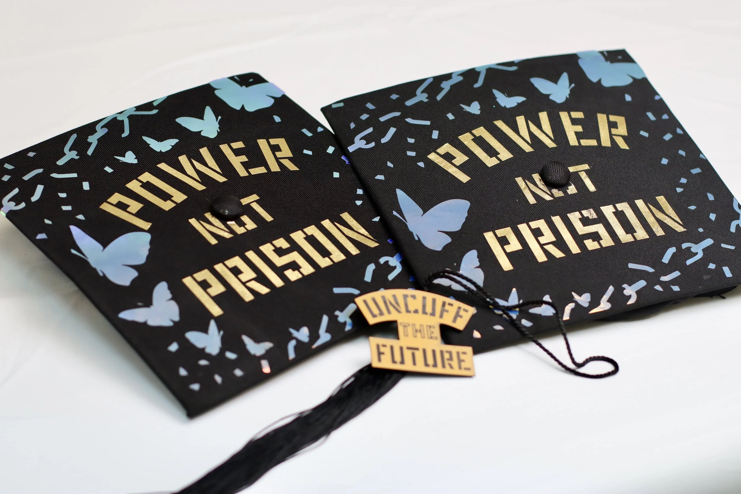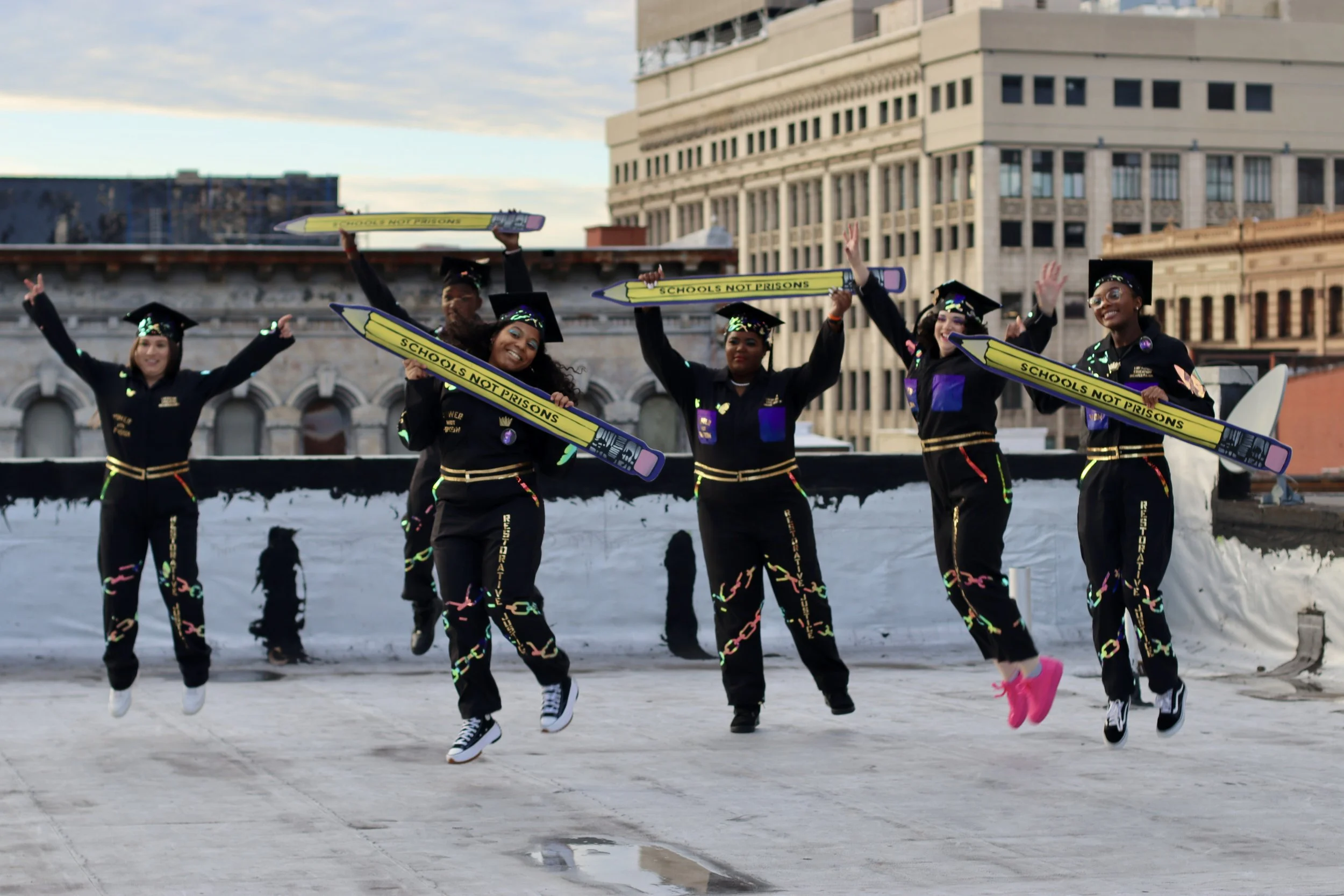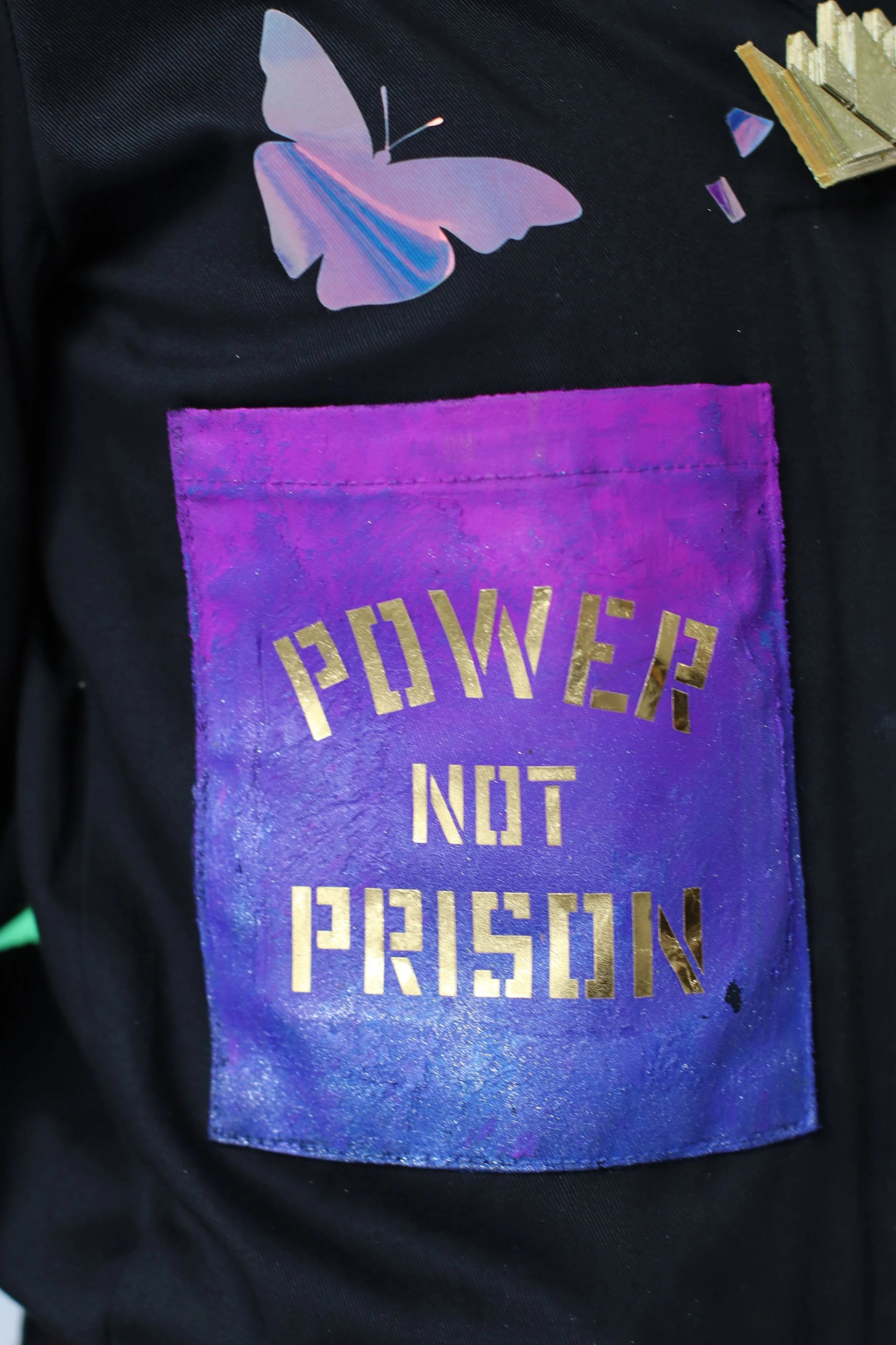 The collaboration included the development of abolitionist jumpsuits envisioned by Y4JNJ organizers from Newark and Camden, New Jersey. The jumpsuit acts as a placard for a series of gold messages illustrating power. Traditionally, jumpsuits are used in prison to make people feel powerless and rob them of individuality. Y4JNJ organizers chose to use this project as an opportunity to take back this garment, using it as a canvas, adorned with holographic chains breaking into butterflies symbolizing positive transformation, liberation, and success. The organizers wear these jumpsuits in the campaign banners, but also as a form of demonstration in organizing events, conferences, and more.